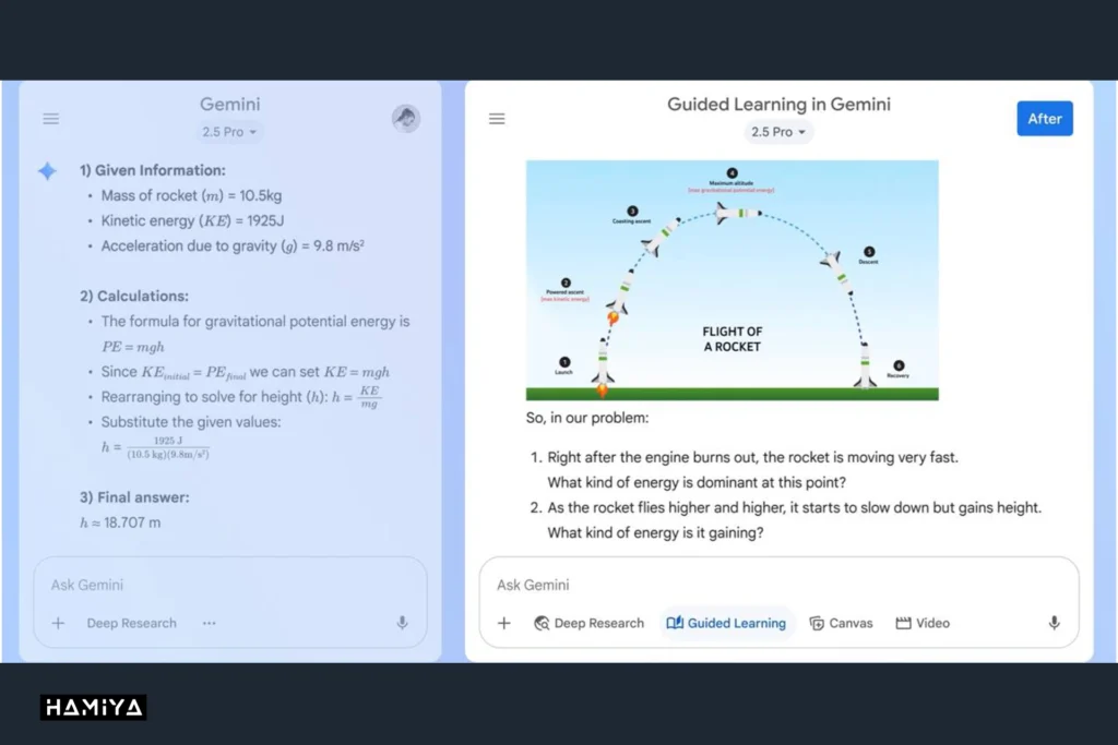 یادگیری هدایت شده در Gemini، پاسخی غنی و چندوجهی ارائه میدهد که شامل تصاویر، نمودارها، ویدیوها و آزمونهای تعاملی است. این ابزارها به کاربران کمک میکنند تا دانش خود را توسعه داده و محک بزنند. در این رویکرد، تمرکز اصلی بر فرآیند یادگیری است و صرفاً به ارائه پاسخ نهایی محدود نمیشود.