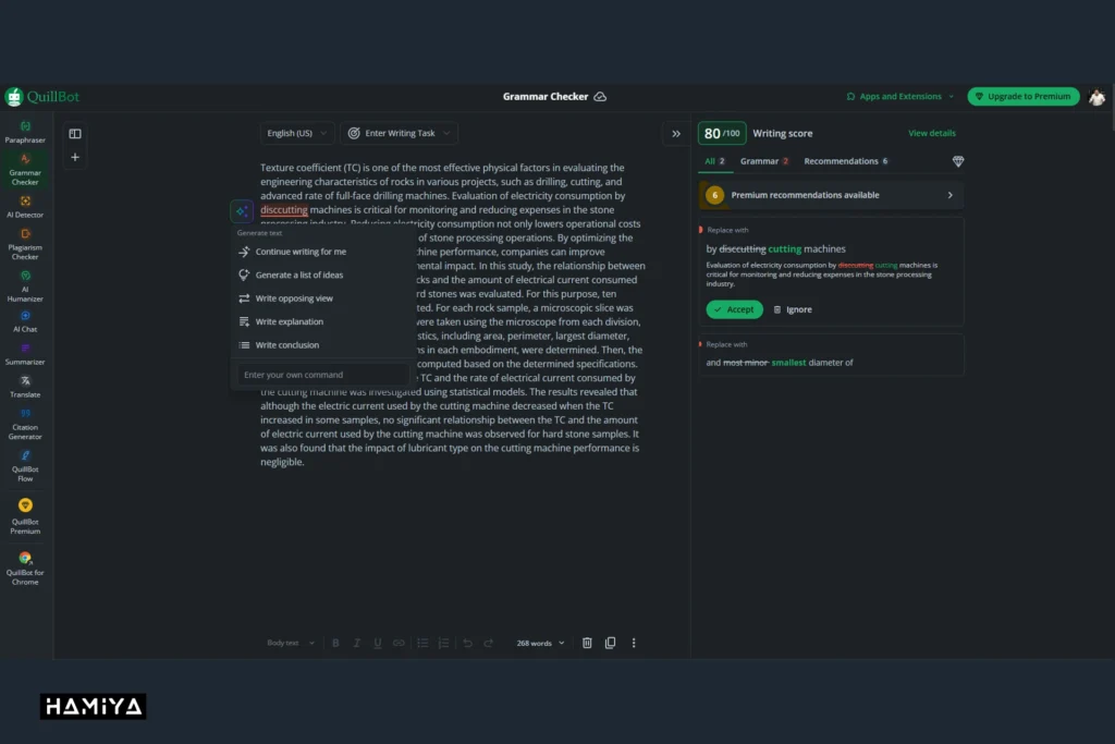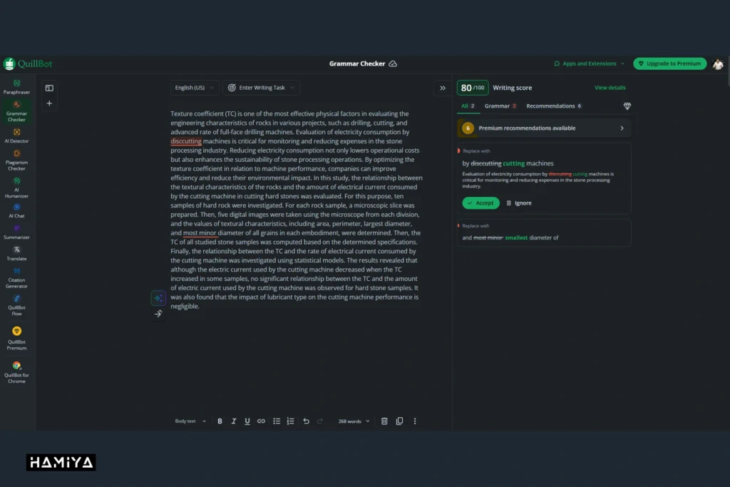 برای ارزیابی کارایی QuillBot AI، آزمایشی از طرف تیم نویسندگان هامیا بر روی پیشنویس مقالهای دیگر که پیشتر برای ژورنال هامیا از Hamiya.Shop نگاشته شده بود، صورت گرفت. این سند در قالب یک فایل Word و شامل ۱,۸۵۳ کلمه بود. پس از بارگذاری پیشنویس، نسخه رایگان Grammarly تقریباً بلافاصله فرآیند پردازش را تکمیل کرد و ۳۸ پیشنهاد اصلاحی مربوط به املا و دستور زبان ارائه داد. در مقابل، QuillBot زمان بیشتری (حدود ۱۰ ثانیه) برای پردازش صرف کرد و ۳۰ پیشنهاد را عرضه نمود.
