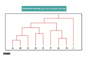- خوشهبندی سلسله مراتبی (Hierarchical clustering): این شکل از گروه بندی دادهها به دو دسته تقسیم میشود: خوشهبندی آگلومراتیو یا روش پایین به بالا (agglomerative) و خوشهبندی تقسیمی یا بالا به پایین (divisive). در خوشهبندی آگلومراتیو، نقاط داده در ابتدا به عنوان گروههای جداگانه تنظیم میشوند و بعداً ادغام می شوند، در حالی که خوشهبندی تقسیمی یک خوشه داده واحد را میگیرد و بر اساس نقاط داده آن را تقسیم میکند.