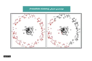 - خوشهبندی احتمالی (Probabilistic clustering): این شکل از گروه بندی نقاط داده بر اساس احتمال تعلق داشتن آنها به توزیع خاصی از دادهها انجام میشود. مدل مخلوط گاوسی (Gaussian Mixture Model) به طور معمول برای نشان دادن زیرمجموعههایی درون کل جمعیت به کار میرود.