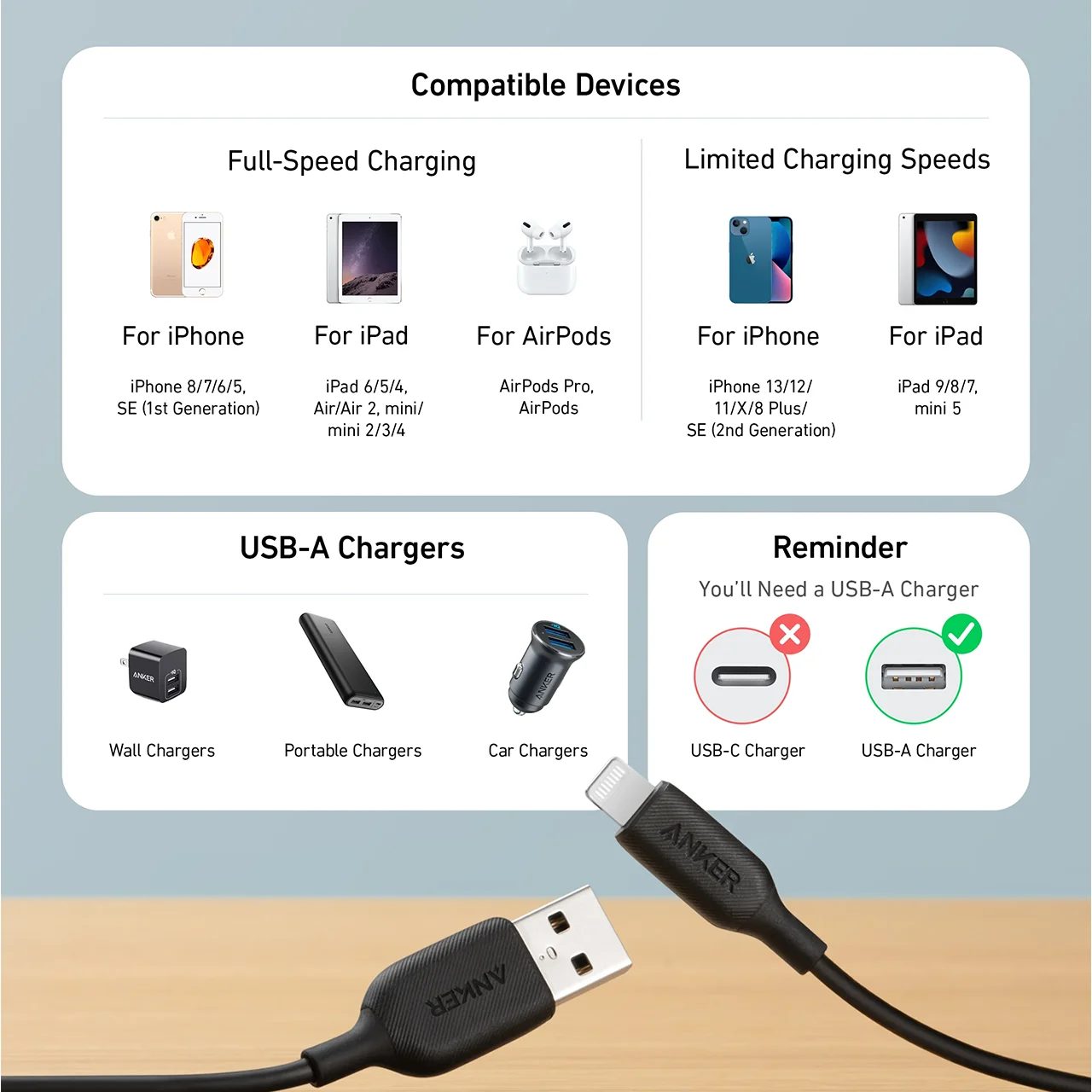 مشخصات کابل تبدیل USB به لایتنینگ انکر مدل A8812 طول 90 سانتی متر