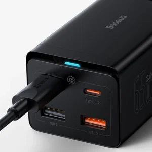 مشخصات شارژر رومیزی بیسوس مدل CCGAN65-1ACE با توان خروجی 65 وات، شارژ سریع 4 دستگاه همزمان و پریز برق