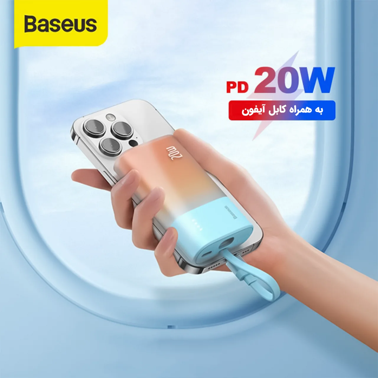 مشخصات پاوربانک بیسوس مدل PPKDC05I با ظرفیت 5200 میلی آمپر ساعت با توان 20 وات و کابل لایتینیگ
