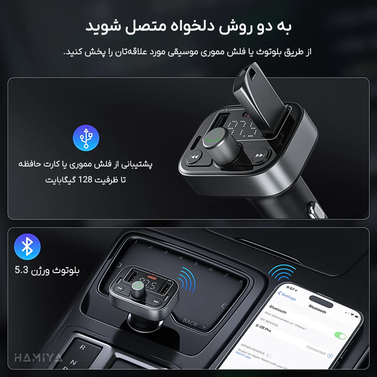 مشخصات شارژر فندکی و پخش کننده بلوتوثی خودرو بیسوس سری S-09 Pro مدل BS-CH010 با توان 18 وات و بلندگوی داخلی