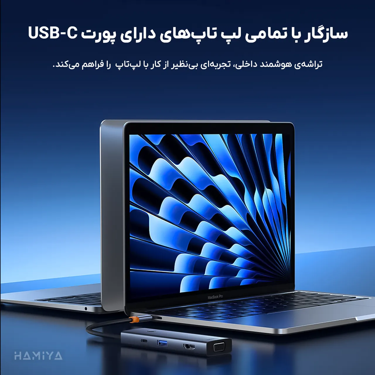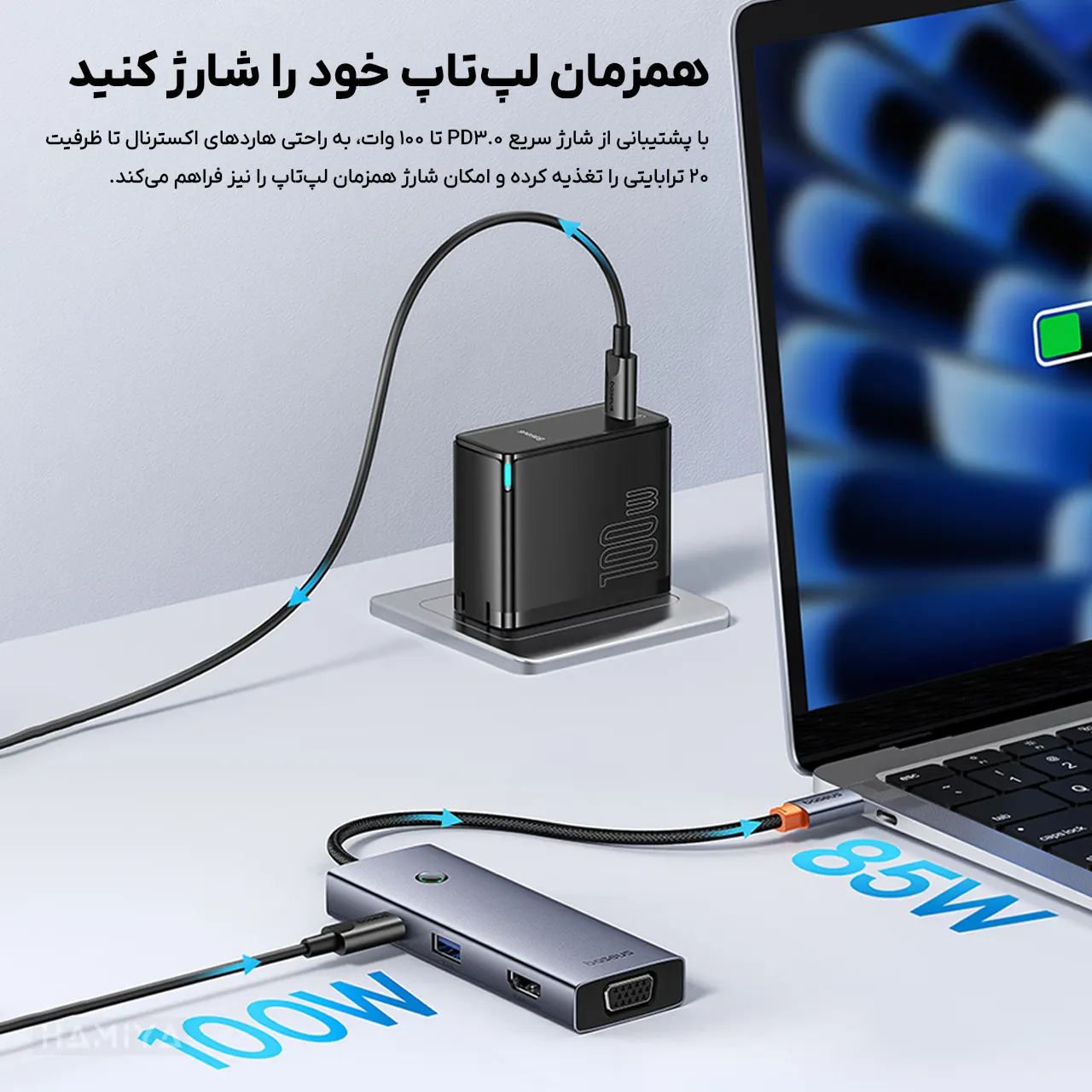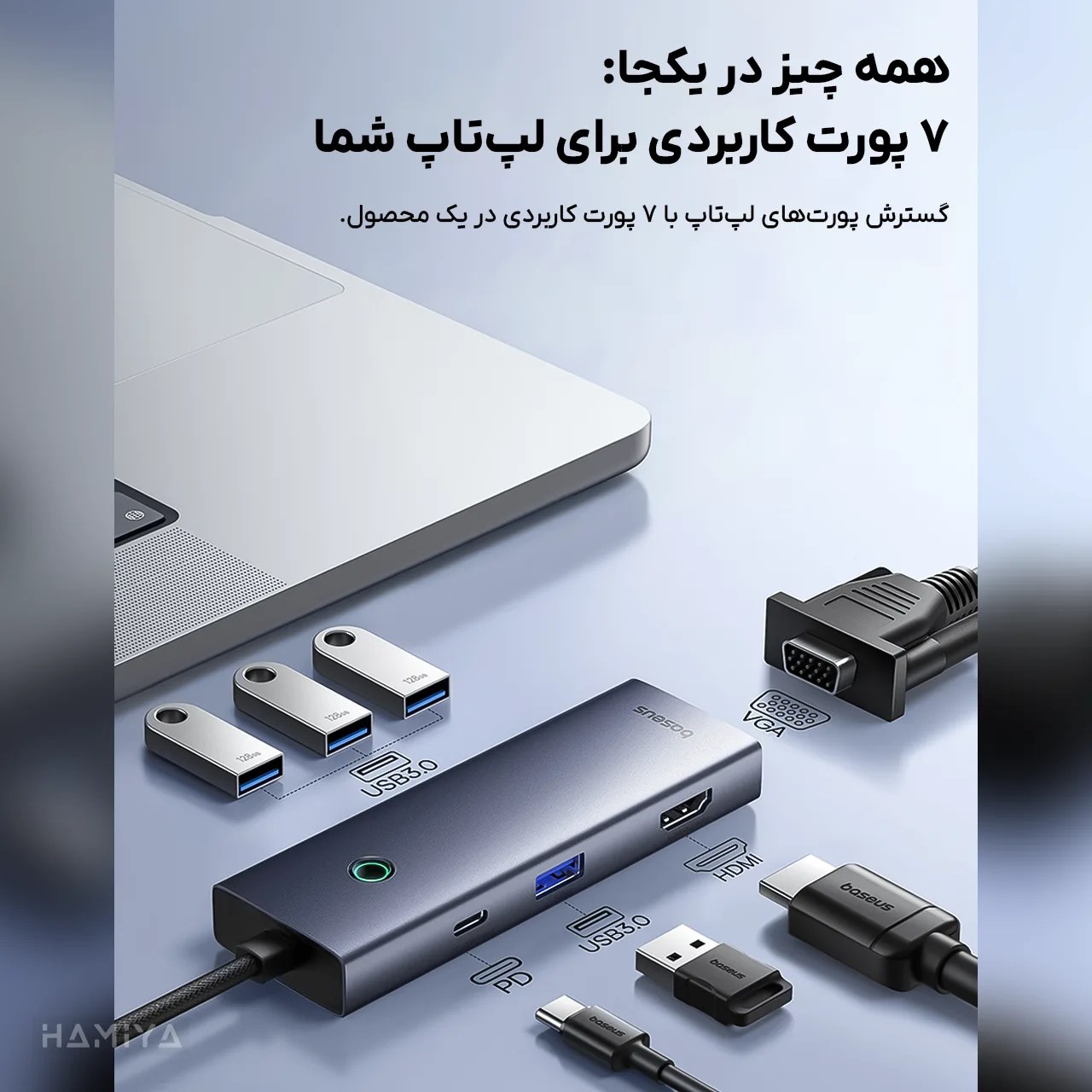 مشخصات هاب 7 پورت تایپ سی بیسوس مدل BS-OH160 با 4 درگاه USB 3.0، درگاه HDMI 4K، درگاه VGA و درگاه تایپ سی