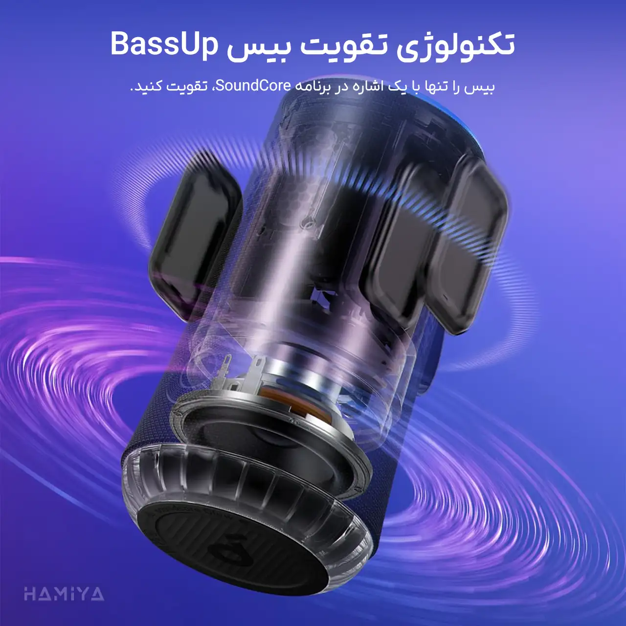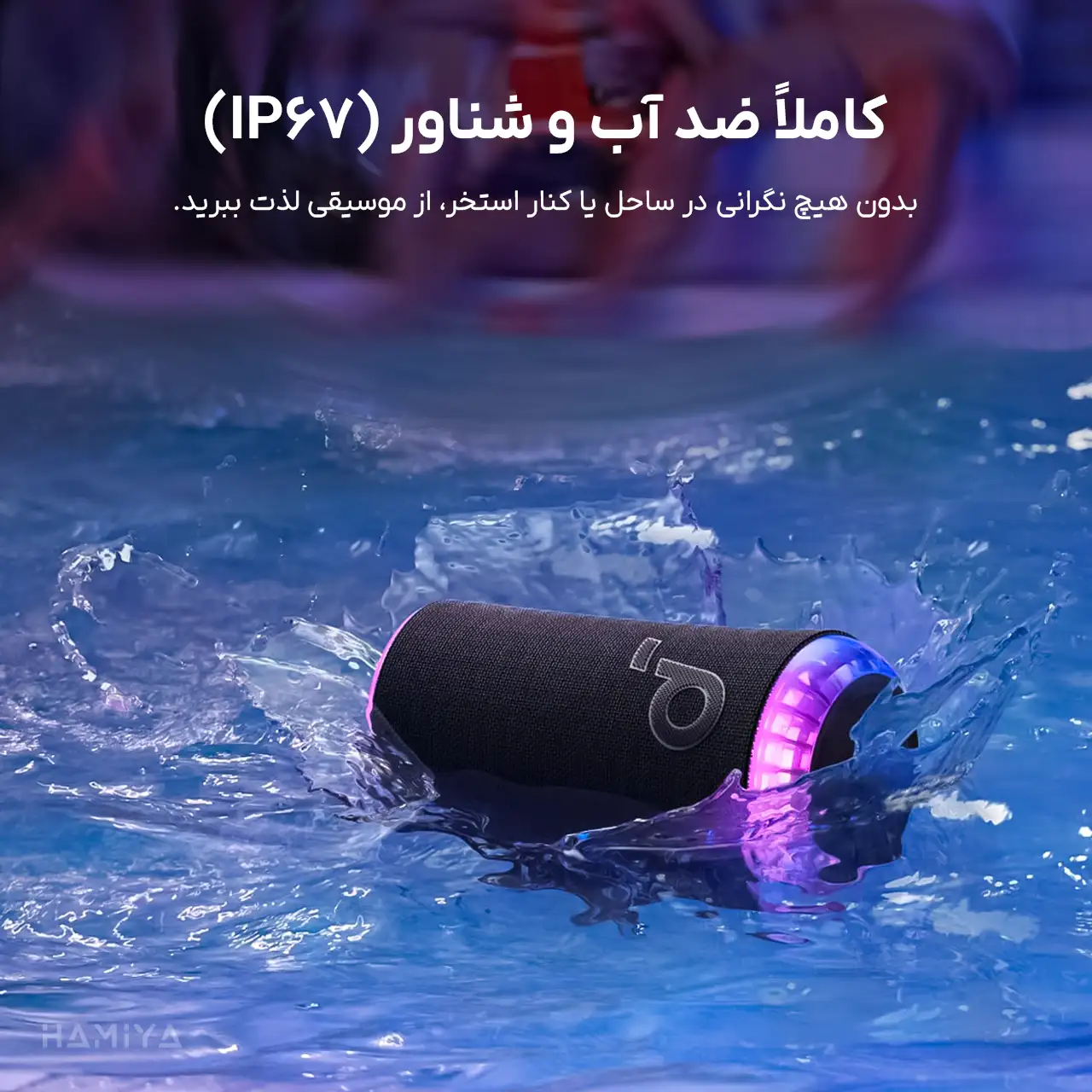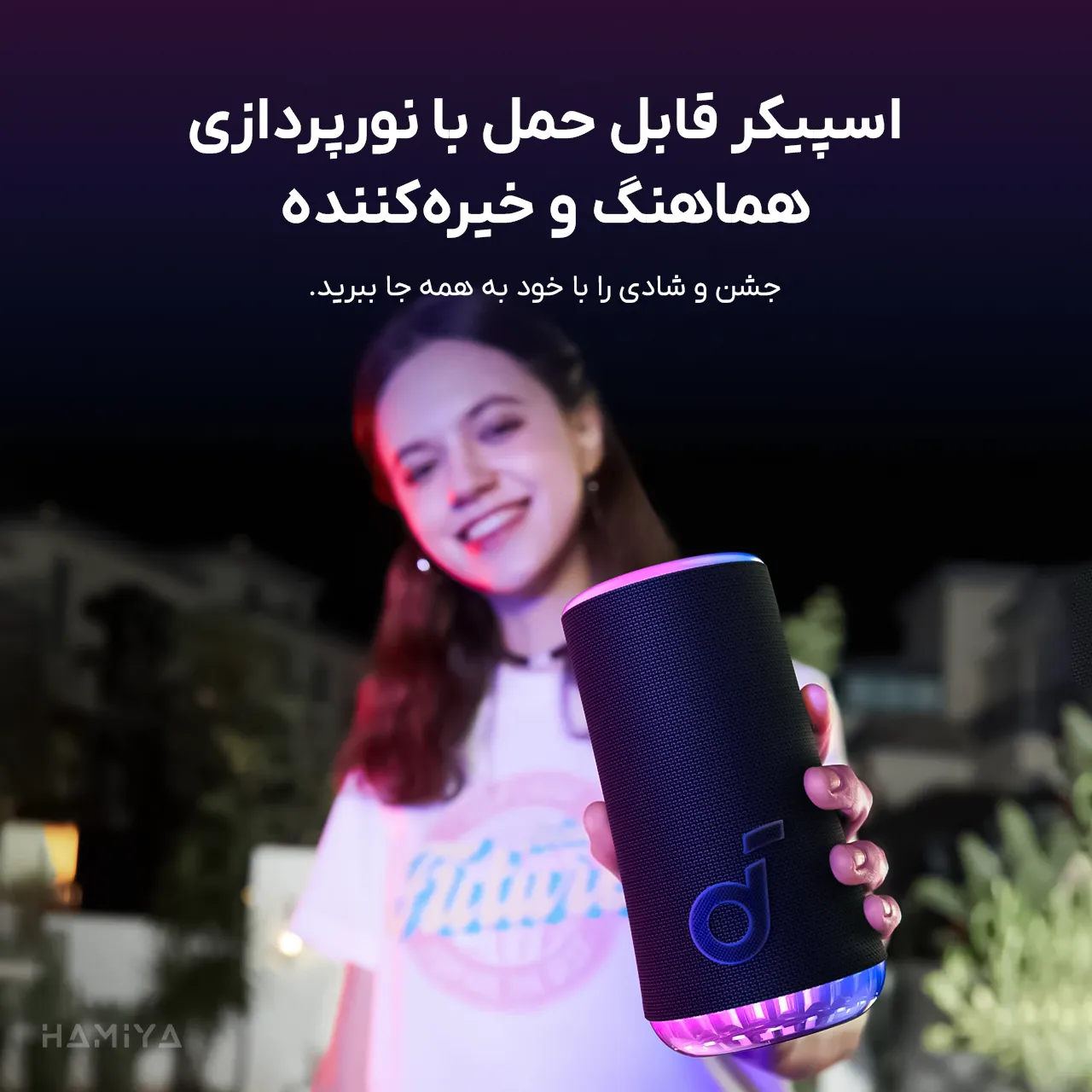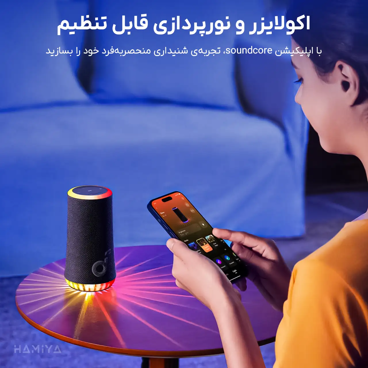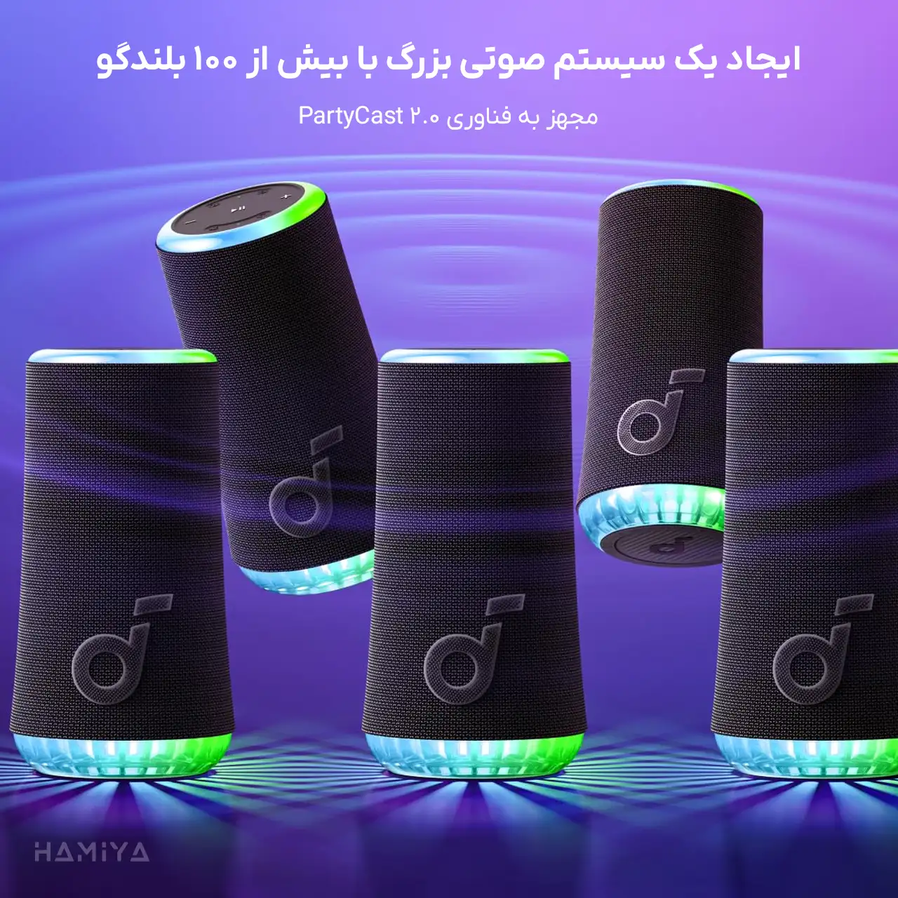 اتصال بیسیم (TWS) دو عدد از این اسپیکر برای صدای استریو, امکان شخصی سازی اکولایزر در نرمافزار Soundcore, حالتهای نورپردازی هماهنگ با ضرب موزیک, دارای فناوری BassUp جهت افزایش عمق و وضوح بیس, دارای فناوری PartyCast 2.0 جهت اتصال تا 100 عدد اسپیکر هم نوع